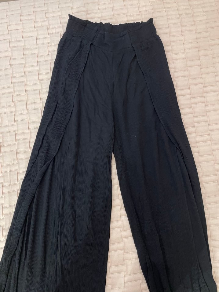 Kadın siyah keten pantolon, bol kesim ve pilili tasarıma sahip, minimalist bohem tarzıyla günlük kullanıma uygundur.