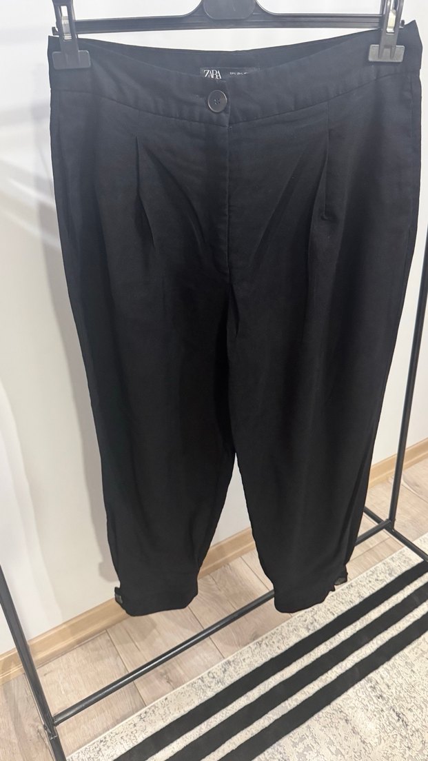 Siyah keten pilili, midi boy, bol kesim kadın pantolon. Ofis kullanımı için uygun, rahat ve trend bir iş stili parçası.
