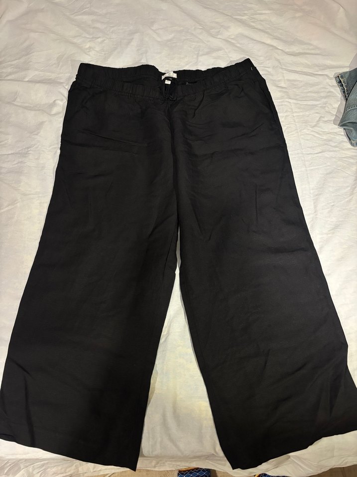 Siyah keten kumaştan, salaş kesim ve midi boyda olan bu pantolon, rahat ve şık bir görünüm sunar.