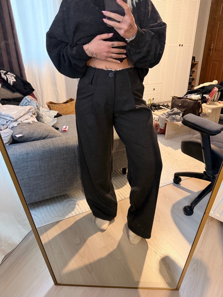 Siyah keten kumaştan, salaş kesim ve midi boyda, günlük rahat kullanım için tasarlanmış, zahmetsiz şıklık sunan kadın pantolonu.