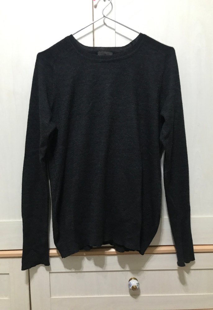 Siyah keten kumaştan, uzun kollu, yuvarlak yakalı, bol kesim, normal midi uzunlukta, desensiz kadın kazak. Günlük kullanıma uygun minimal stil.