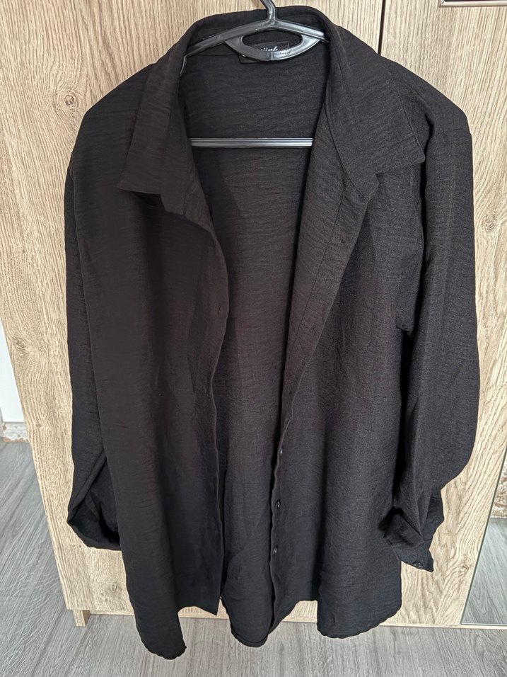 Siyah keten kadın gömlek, çıtçıtlı, uzun kollu ve uzun kesim olup, minimal bohem tarzda bol kesimdir.