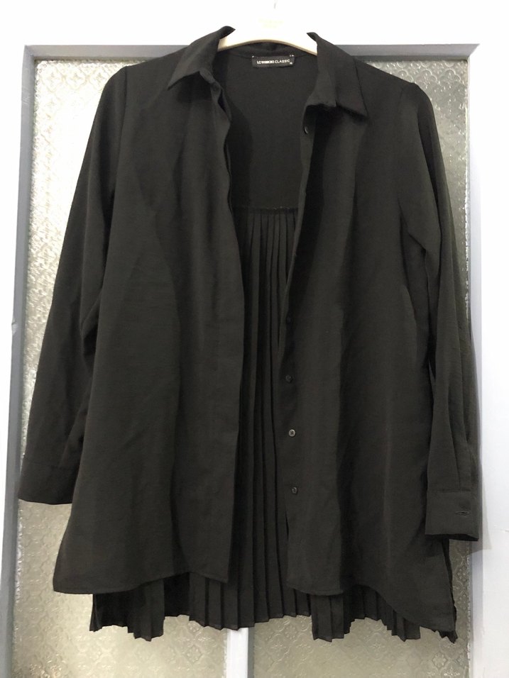 Uzun kollu, keten kumaştan, pilili detaylı ve geniş kesim siyah kadın gömleği. Gotik tarzda, günlük kullanım için uygundur.