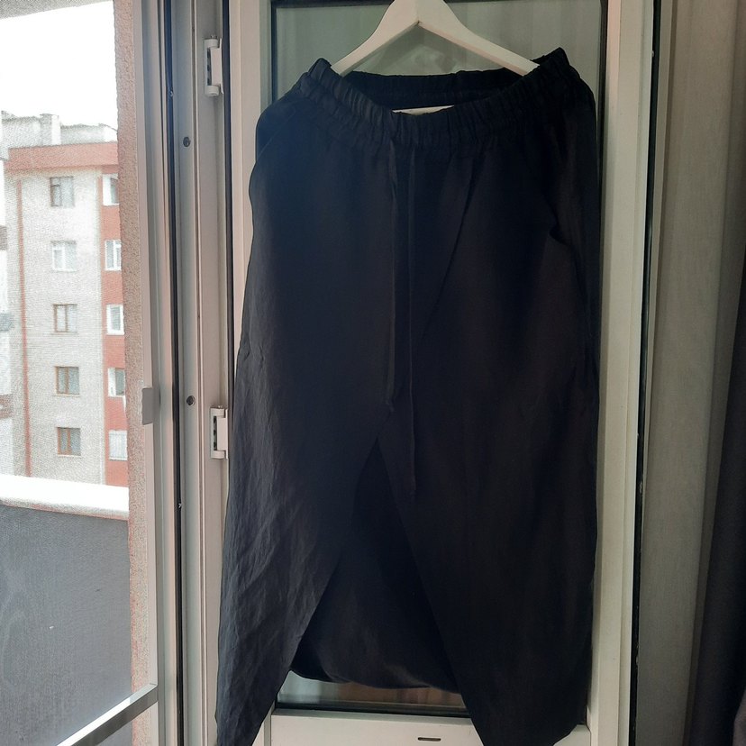 Siyah keten kumaştan, salaş kesimli ve drapeli uzun etek pantolon, minimalist tarzı günlük rahatlıkla buluşturur.