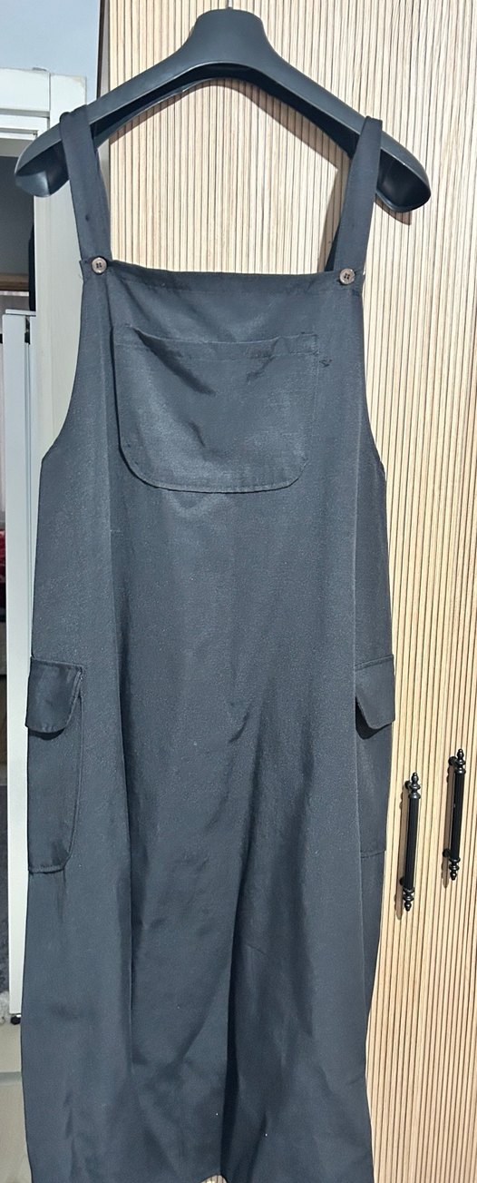 Siyah keten kumaştan, bol kesim ve drapeli uzun tulum. Kolsuz ve yüksek yakalı, minimalist gotik stil için uygun.