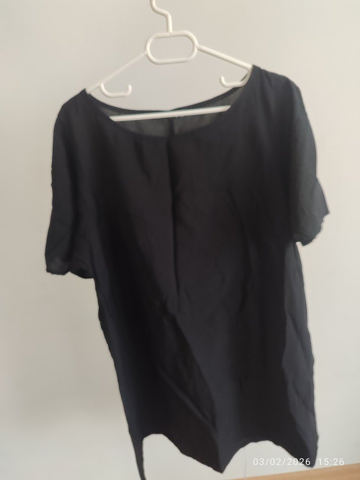 Kadınlar için keten kumaştan, V yaka, kısa kollu ve salaş kesime sahip siyah bluz. Midi boyda, drapeli ve desen içermeyen sade tasarım. Günlük kullanıma uygun.