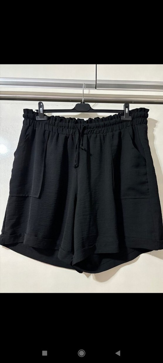 Yumuşak keten kumaştan yapılmış siyah yüksek bel mini şort. Bol kesimi ve bel kısmındaki fırfır detayıyla günlük sokak stili için uygundur. ürünü bu uygulamadan aldım bol geldigi için değiştirmek istemedim