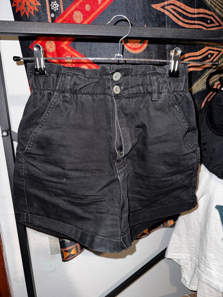 Siyah renkli, bol kesimli denim şort. Günlük rahat ve sokak modasına uygun.