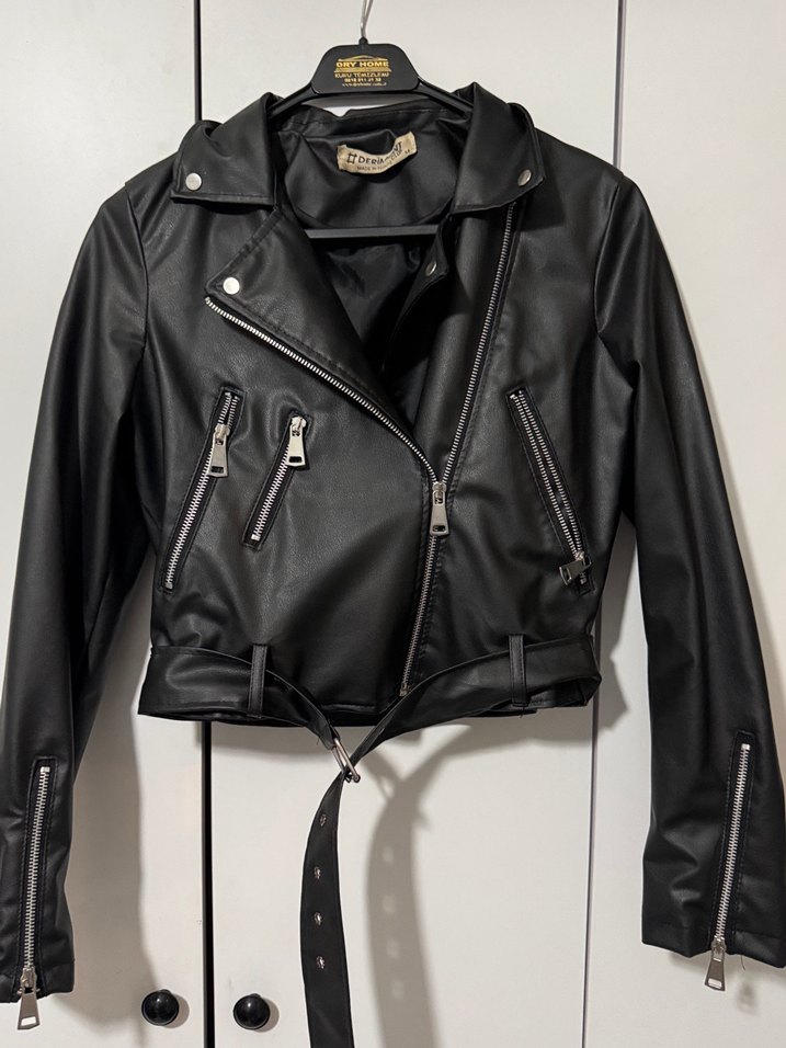 Siyah deri, kısa kesim, kemerli ve strappy kollu, notched lapel yakalı, grunge punk tarzı kadın biker ceketi.