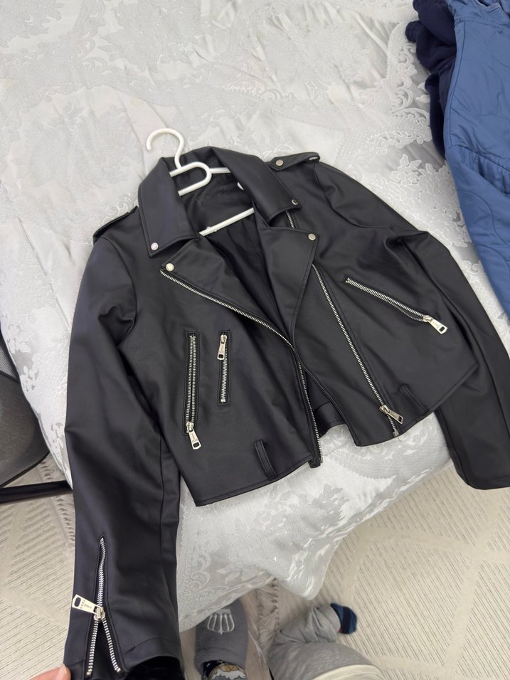Siyah deri, kısa ve fitted kesim ceket, çıtçıtlı yaka ve fermuarlı detaylara sahip, trend sokak stili için ideal.