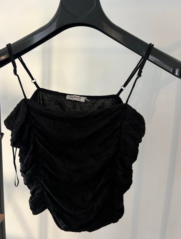 Siyah renkli, kısa kesim, drapeli ve halter yakalı, ince askılı, fit kesim keten bustiyer. Gotik tarzda cesur bir görünüm sunar.