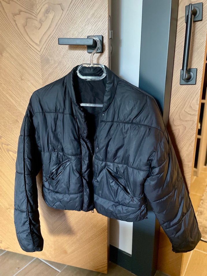 Kadınlar için siyah, kısa kesim mont. Yüksek yakalı, uzun kollu ve rahat bir dokuya sahip, günlük kullanıma uygun sade tasarım. Az kullanılmıştır temiz ve yeni gibi.