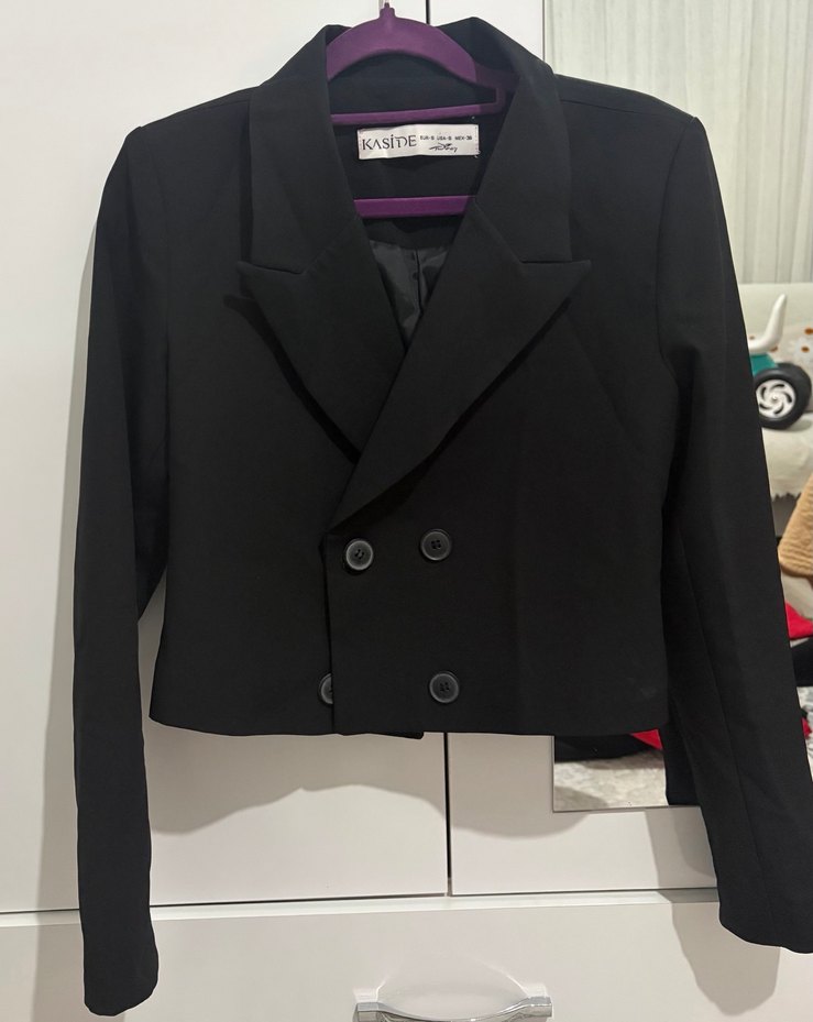 Kadın siyah blazer, keskin yaka, uzun kollu ve çift düğmeli kapamalı. Kısa, regular fit ve düz desenli, ofis ve sokak stiline uygun.