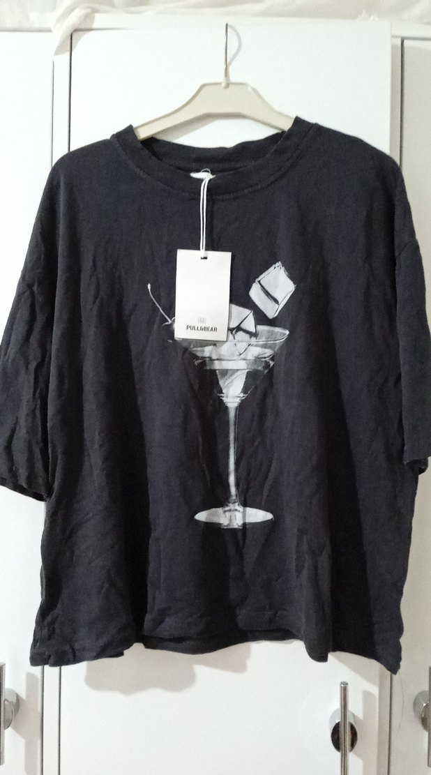 Kısa kollu, siyah kumaştan, baskılı ve bisiklet yakalı, normal boyda, rahat kesim kadın tişörtü. Parti için uygun, zahmetsiz şıklık sunar.