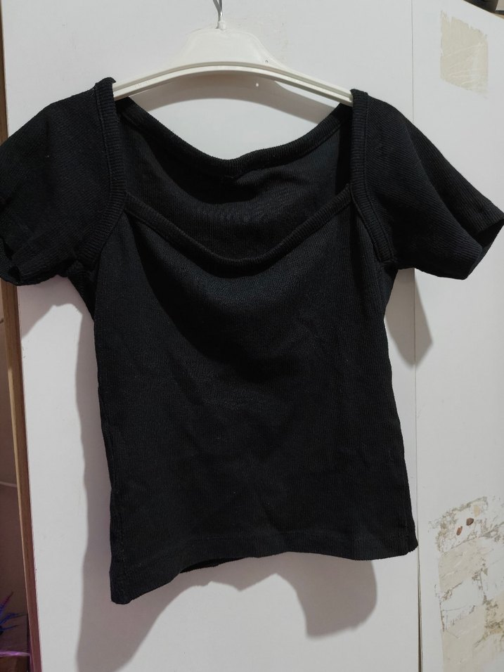 Düz siyah, kısa kollu ve tekne yaka, vücuda oturan crop top. Düzgün sentetik kumaştan yapılmış, günlük ve gotik tarzda.