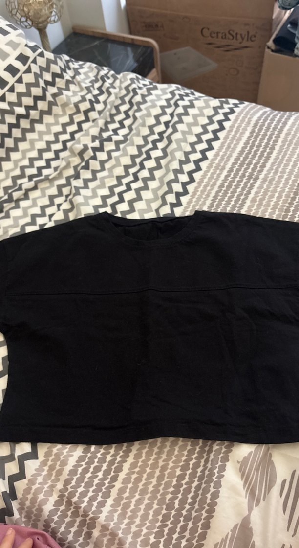 Kadınlar için siyah renkli, kısa kollu ve salaş kesim crop top. Sentetik kumaştan, günlük kullanım ve sokak stili için uygundur.