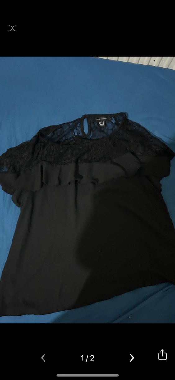 Siyah renk, kısa kollu, fırfırlı ve yuvarlak yakalı kadın bluzu. Gevşek kesim, gotik tarzda, sentetik kumaştan günlük kullanım için.