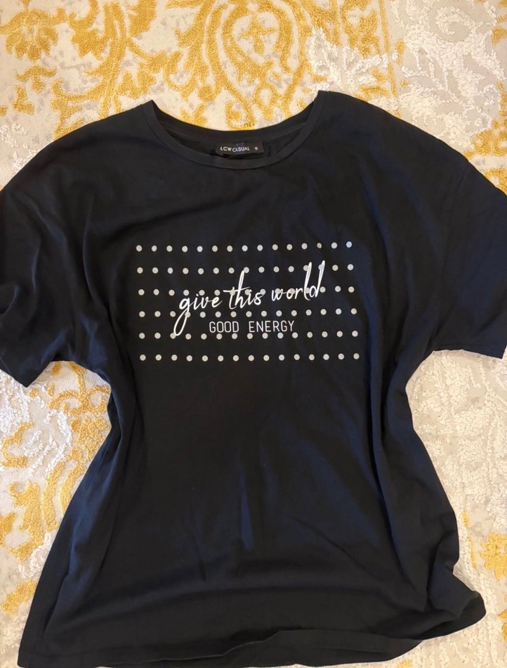 Pamuklu, kısa kollu, yuvarlak yaka, bol kesim siyah tişört. Üzerinde payetli ve "GOOD ENERGY" yazılı baskı bulunur. ✨