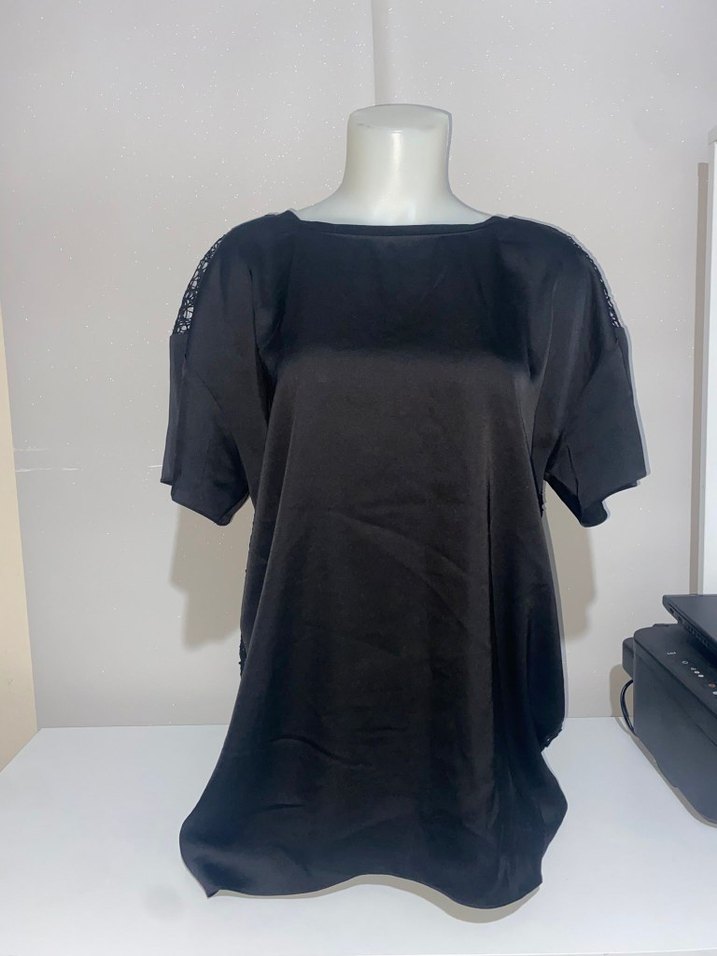 Saten kumaştan, kısa kollu ve yuvarlak yakalı siyah bluz, rahat kesimiyle günlük kullanıma uygun şık bir tasarımdır.