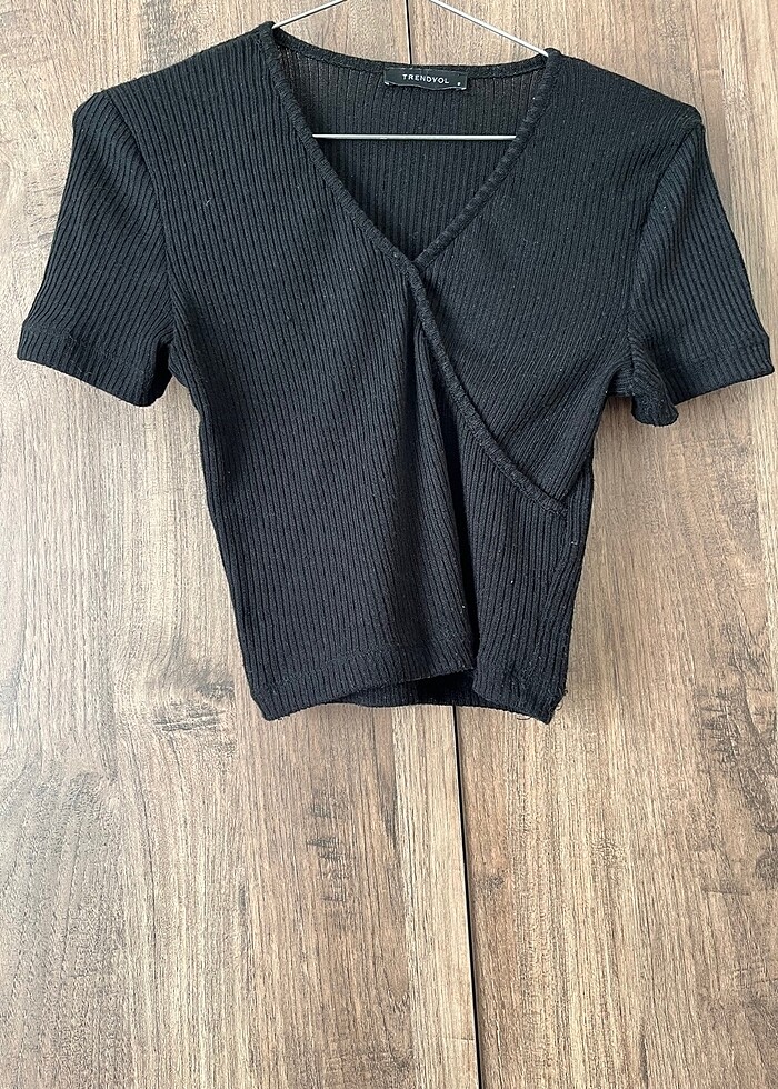 V yaka, trikodan. 1-2 kez giyildi kumaşı dolayısıyla tüy topluyor gibi görünse de yapışkanlı tüy toplama aletiyle hemen geçiyor. Güzel bir yaka kesimi var. S-m bedene rahatlıkla olur