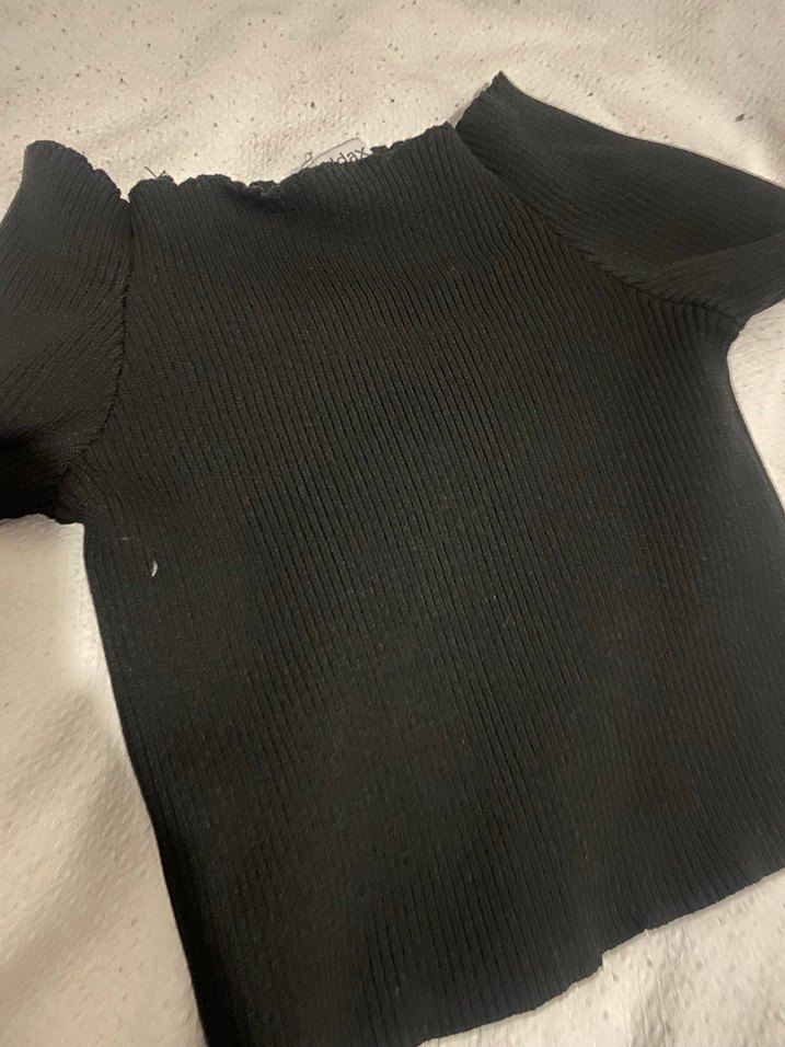 Düz siyah renkli, kısa kollu ve kayık yaka, vücuda oturan triko bluz. Yumuşak sentetik kumaştan örülmüş, günlük rahat kullanım için uygundur.