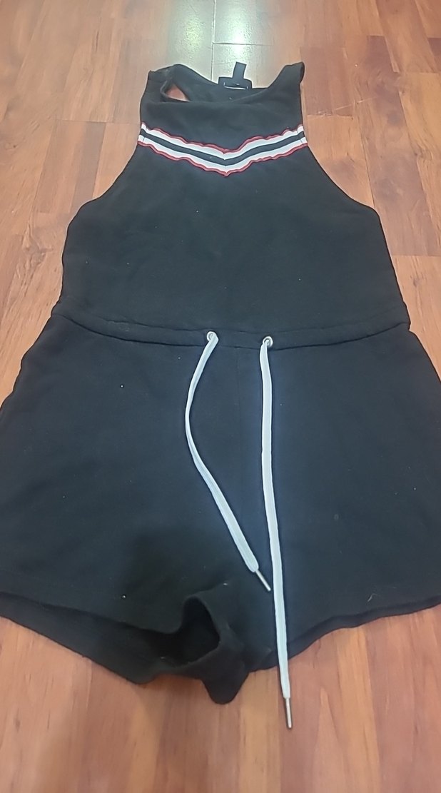 Siyah, kolsuz kısa tulum, yüksek yakalı ve kemerli, trend rahat görünüm sunar. Yumuşak ve sıcak kumaştan üretilmiştir, spor ve sokak giyimine uygundur.