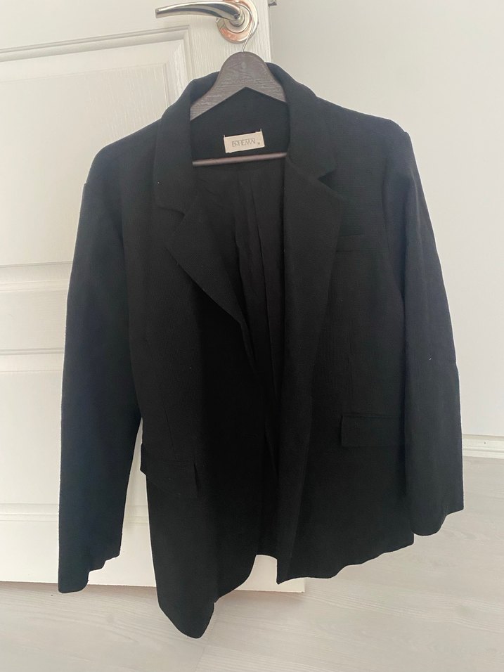 Siyah keten kumaştan, klasik kesim, uzun kollu kadın blazer. Ofis ortamı için uygun, rahat ve şık bir parça. Vatkalari cikarilmistir. Vatkasizdir.