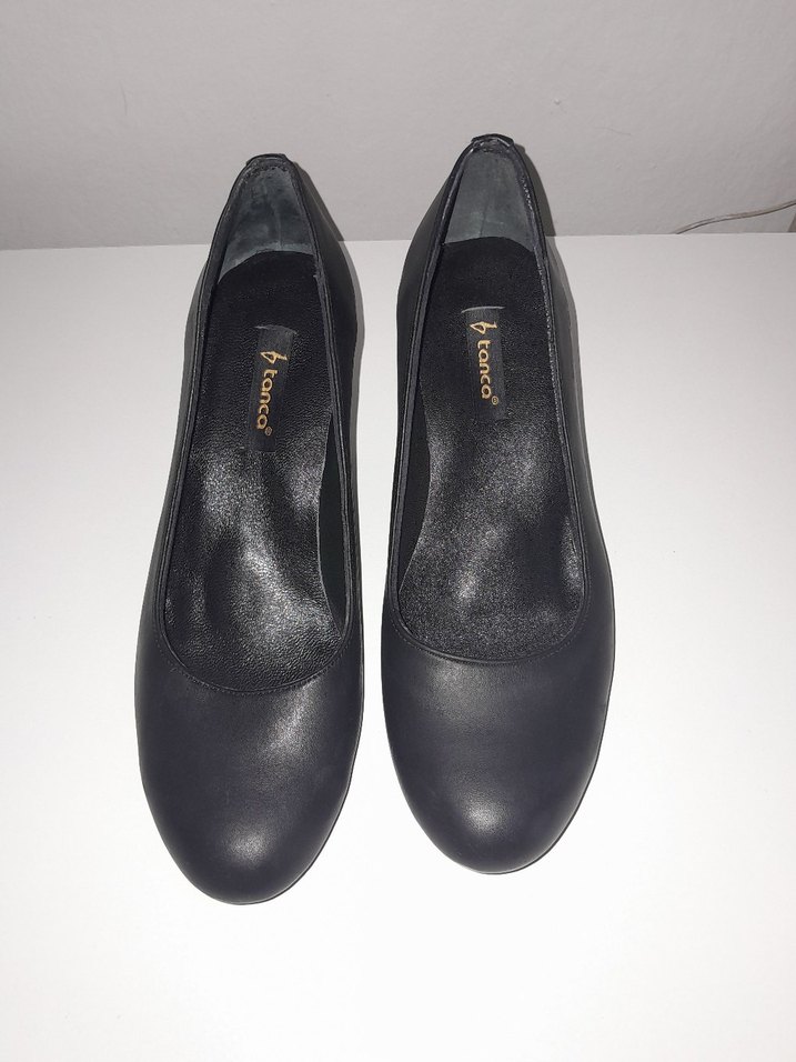 Kauçuk tabanlı, blok topuklu siyah kadın klasik ayakkabılar, minimalist tarzda ve ofis kullanımı için uygun. kutusu yok