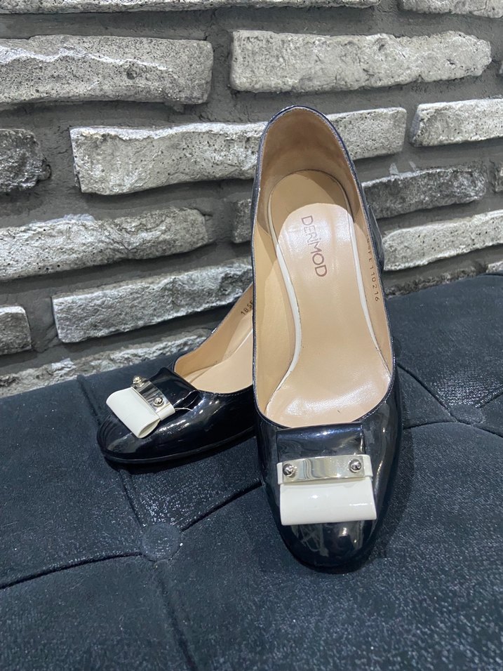Kadınlar için siyah, klasik topuklu babet. Önde tokalı detay ve parlak yüzeye sahip, günlük kullanıma uygun.Sadece ev ayakkabısı olarak kullanılmıştır. Gayet temiz ve yenidir