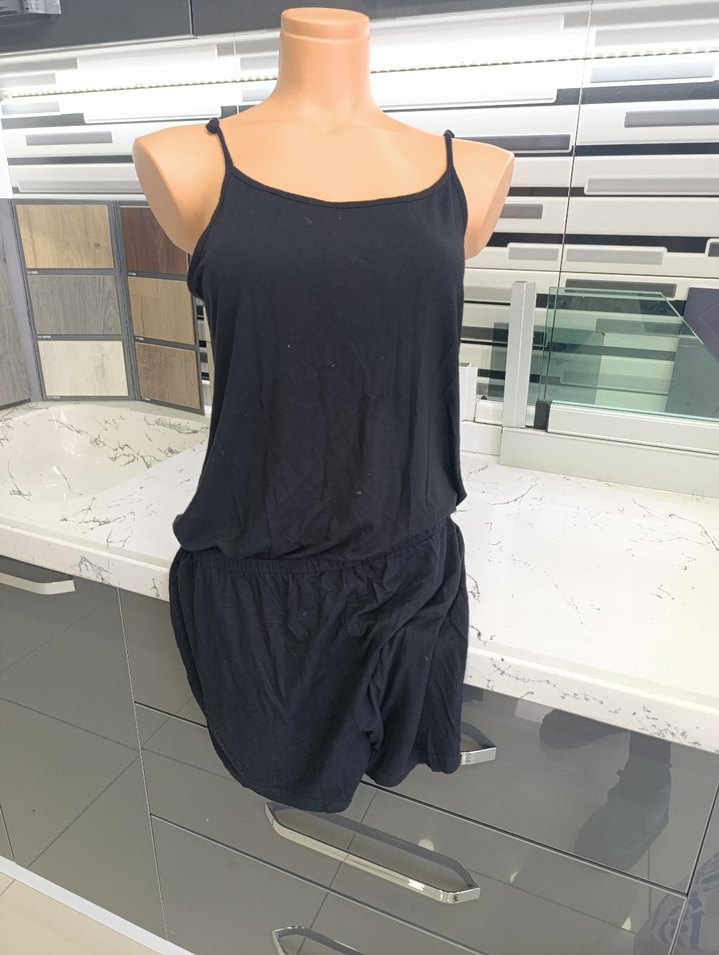 Kolsuz, siyah mini tulum, bol kesim ve ince askılı yakaya sahip. Sentetik kumaştan üretilmiş, günlük kullanım için uygun, rahat ve şık.