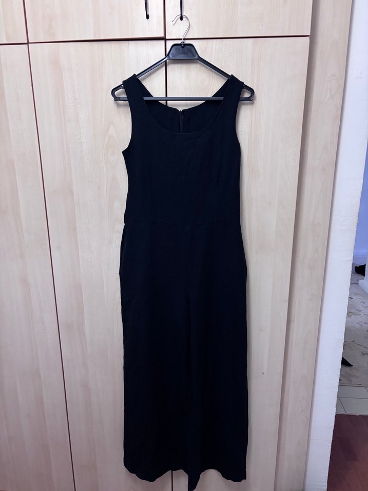 Fitted kesim, kolsuz, siyah keten tulum. Yuvarlak yaka ve uzun boy ile günlük kullanıma uygun, minimal ve normcore tarzda şık bir parça.