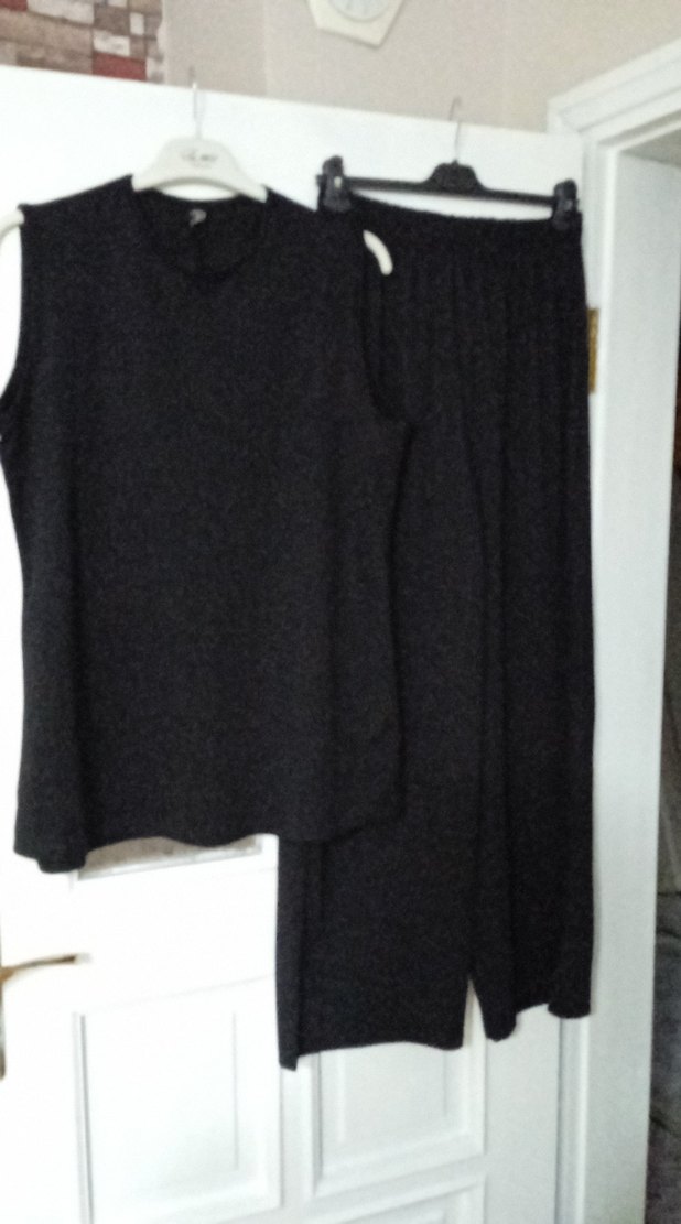 Kadın siyah kolsuz pantolonlu takım, yüksek yakalı ve bol kesimlidir. Yumuşak keten kumaştan, minimalist ve desensiz tasarımıyla ofis için uygundur.