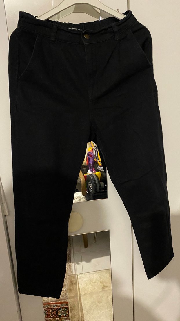 Siyah renkte, kot kumaştan yapılmış, bol kesim, beli lastikli kadın boyfriend pantolon. Günlük rahat kullanım için uygundur.