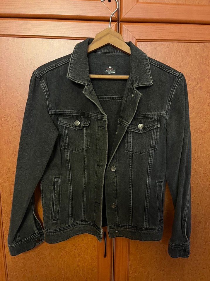 Bu kadın siyah denim ceket, düğmeli ön, uzun kollu. Normal kesim ve midi boydadır
