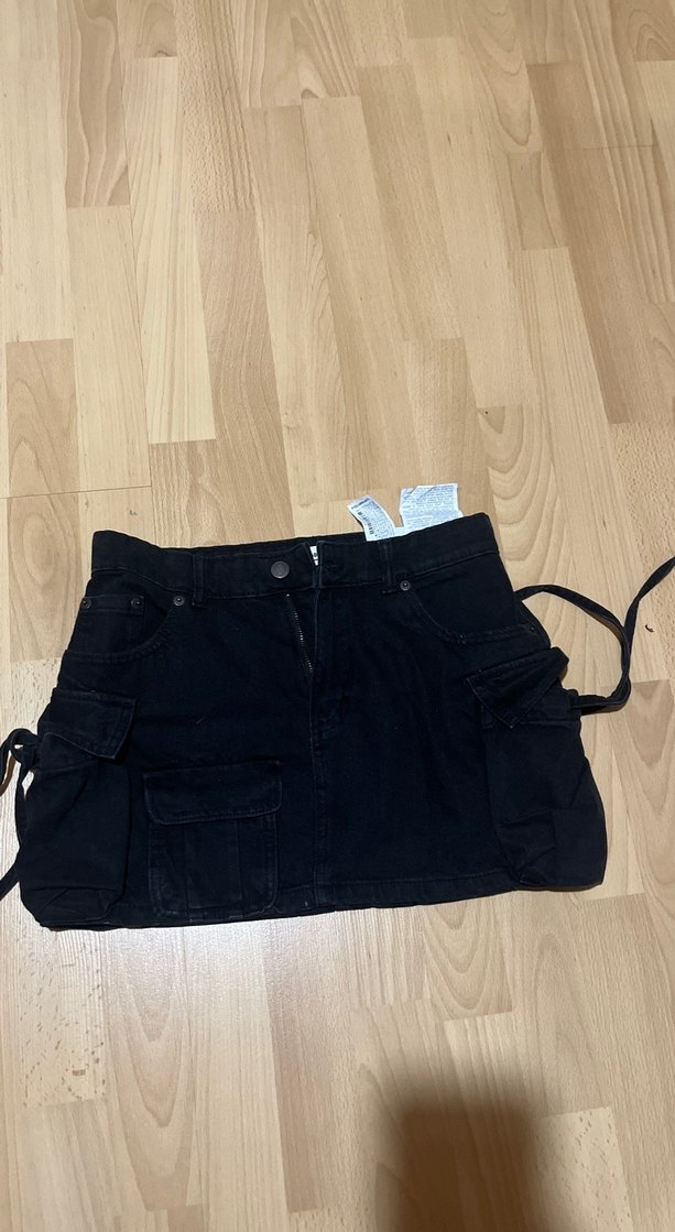 Siyah kot kumaştan, bol kesim ve kemerli kısa mini etek. Sokak stiline uygun, yan cepleri bulunan deseniz rahat bir model. Kargo kesim