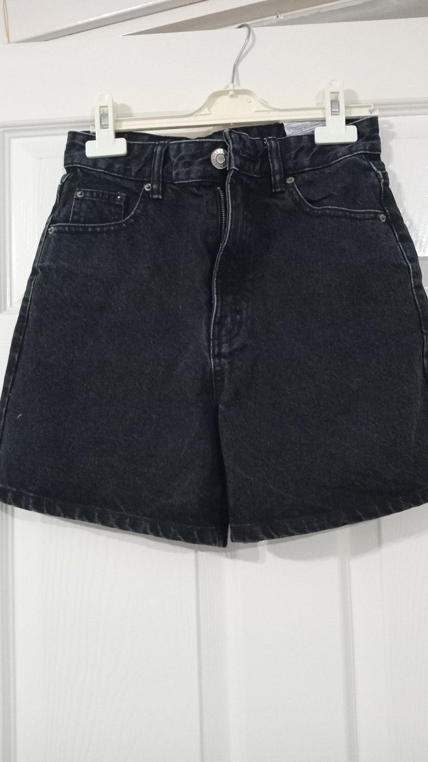 Kadın Siyah Kot Şort, Bol Kesim, Kemerli