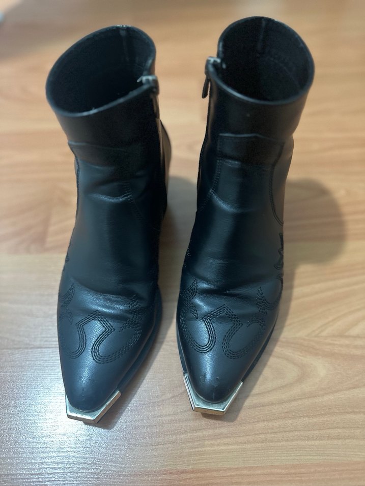 Siyah deri kadın botları, kovboy tarzda ve metal uçlu sivri burunlu. Günlük ve şık kullanıma uygun. Topuğu 4-5 cm civarında. Çok rahat, bütün gün yürüseniz ayak ağrıtmıyor.