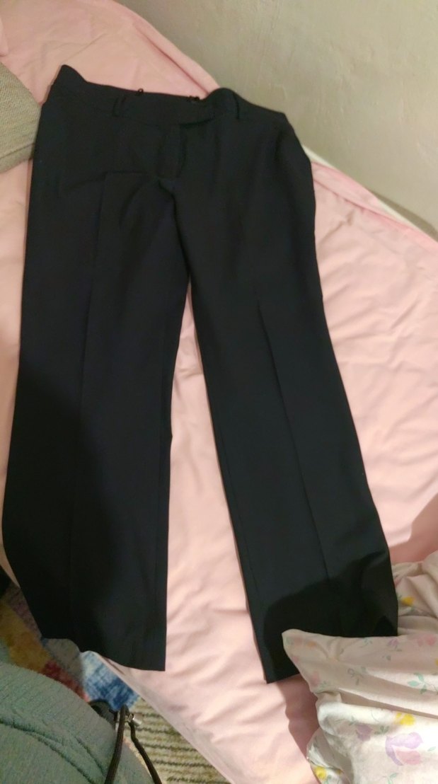 Kadınlar için siyah, kemerli, normal kesim kumaş pantolon. Midi boyda, desensiz ve ofis için uygun basit tasarım.
