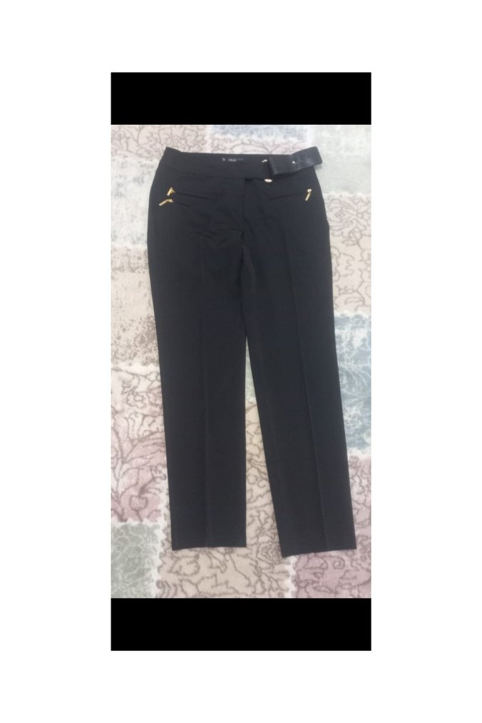 Kadın siyah kumaş pantolon, kemerli ve normal boyda, ofis ve günlük sokak stili için uygundur. Düz ve fermuarlı ceplidir.