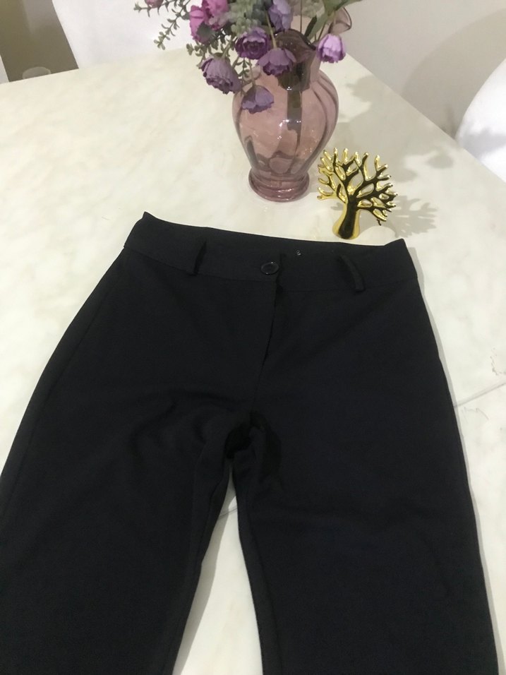 Kadınlar için siyah, kemerli ve normal boyda kumaş pantolon. Ofis kullanımı için uygun, düz ve basic tarzda, sentetik kumaştan. İspanyol paça