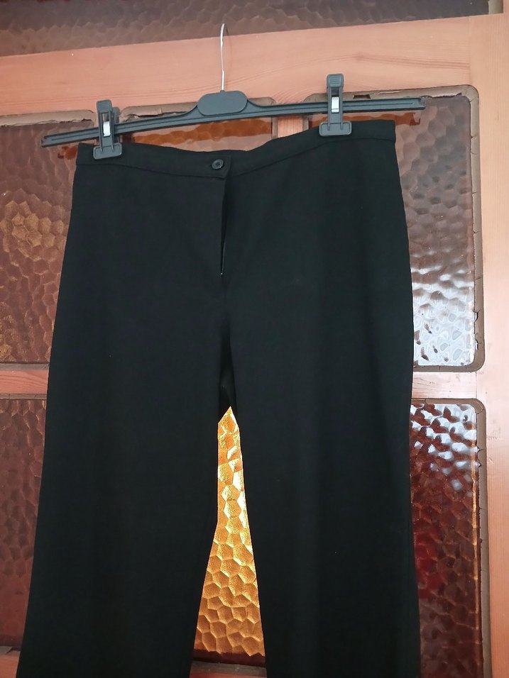 Kadın siyah kumaş pantolon, regular fit ve midi boydadır. Kemerli beli ve yumuşak sentetik kumaşıyla ofis ve günlük kullanıma uygundur.
