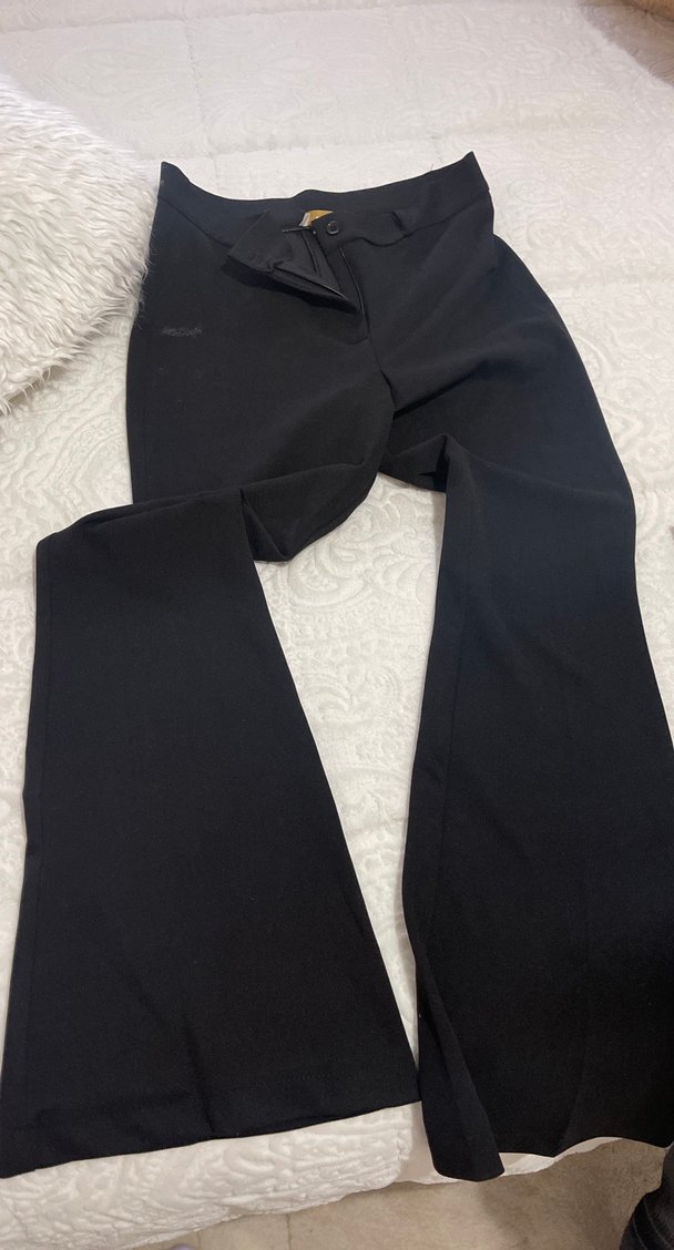 Kadınlar için siyah kumaş pantolon, normal boy ve regular fit. Kemerli detaylı, desen içermeyen, ofis kullanımı için uygun.