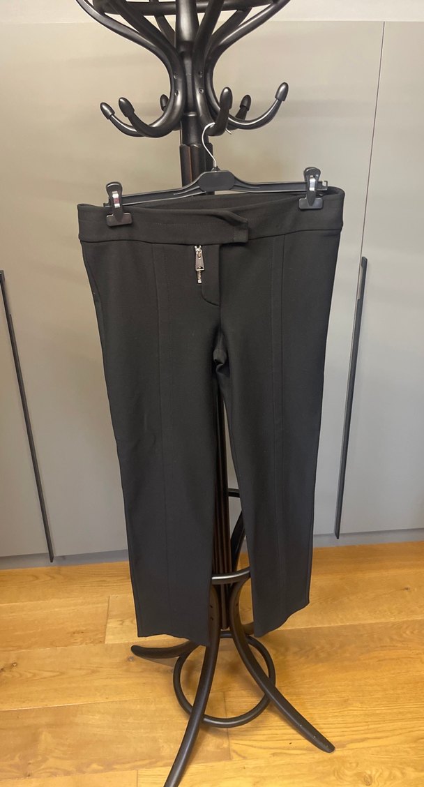 Kadın siyah kumaş pantolon, kemerli ve regular fit kesimlidir. Midi boyu ve sentetik kumaşıyla ofis ve günlük şıklık için uygundur.
