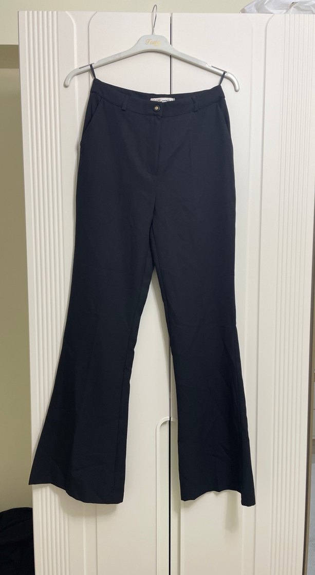 Kadınlar için siyah kumaş pantolon, normal boy ve regular fit. Pürüzsüz sentetik kumaştan üretilmiş, ofis kullanımı için şık ve rahat bir görünüm sunar. İspanyol paça