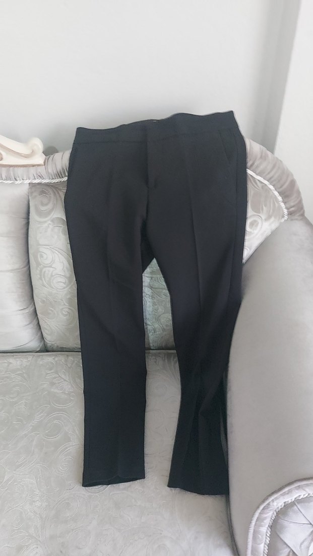 Siyah, midi boy, regular fit kumaş pantolon, ofis ve gündelik şıklık için uygun, tokalı detaylı, yumuşak sentetik kumaştan.