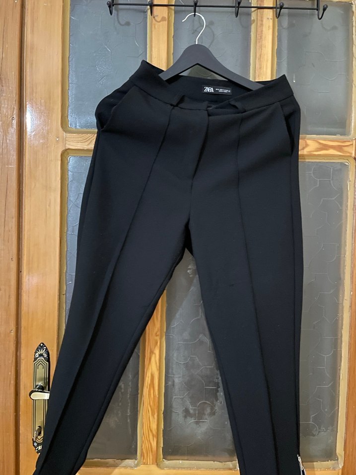 Kadın siyah kumaş pantolon, midi boy ve regular fit. Yumuşak ve sıcak kumaştan, tokalı detaylı, ofis ve günlük kullanıma uygun.