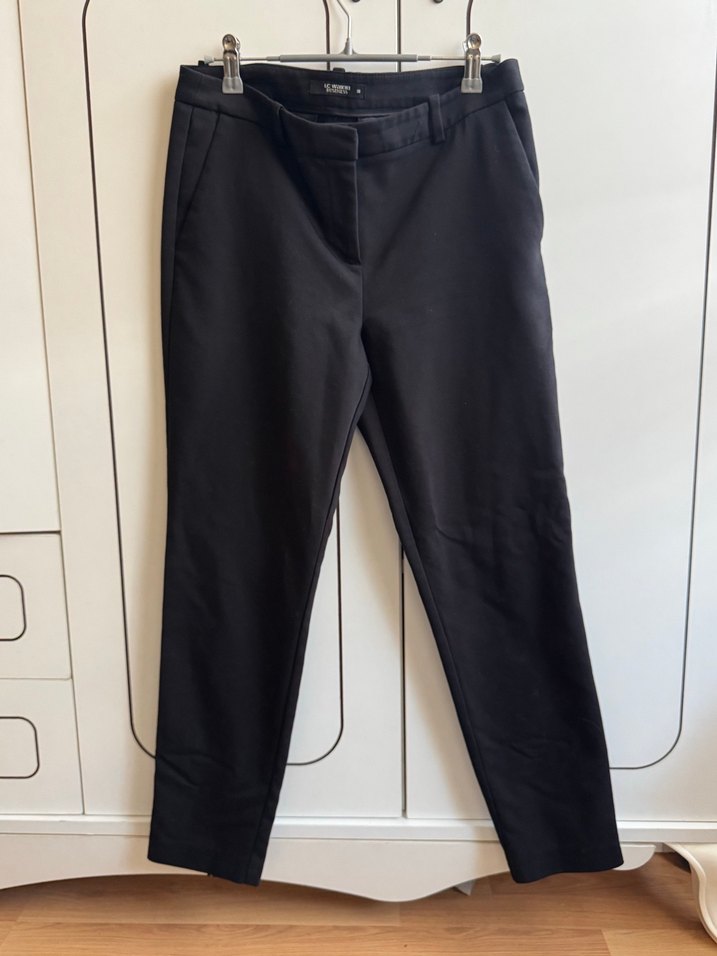 Kadınlar için siyah kumaş pantolon, normal kesim ve midi boyda, yumuşak sentetik kumaştan yapılmıştır. Ofis için rahat ve şık bir tercih.
