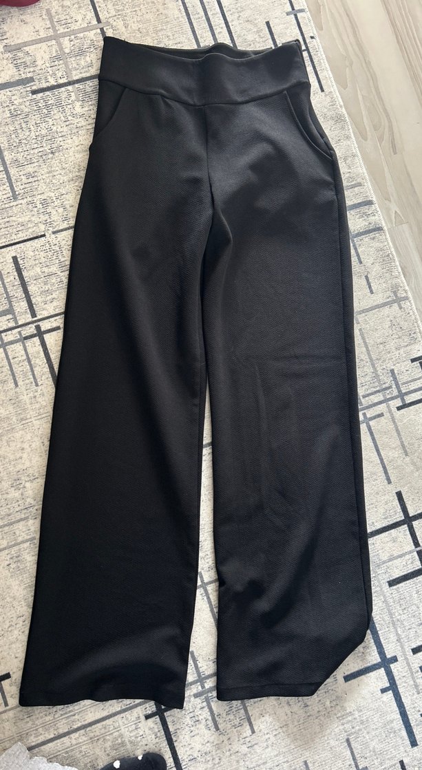 Kadınlar için siyah kumaş pantolon, rahat kesim ve uzun boy. Düz, sentetik kumaştan yapılmış, ofis ve sokak stili için zahmetsiz şıklık sunar.