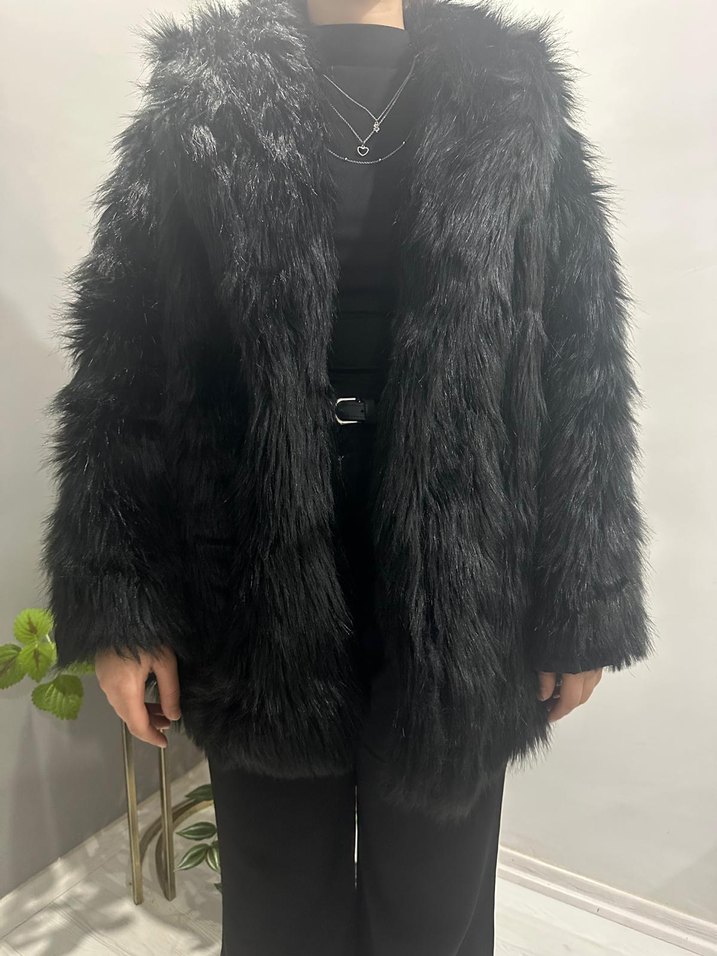 Siyah kürk detaylı bol kesim uzun kollu ve yakalı cepli kadın ceketi. Günlük kullanıma uygun, desensiz rahat ve şık bir cekettir.✨
