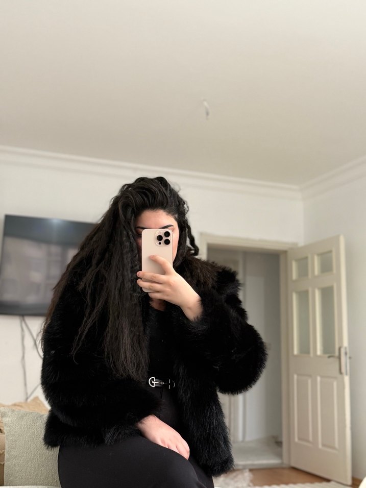 Siyah, uzun kollu ve yüksek yakalı, yumuşak ve sıcak kumaştan yapılmış kürk detaylı fitted mont. Gotik ve rock punk tarzına uygun, günlük kullanıma ideal.